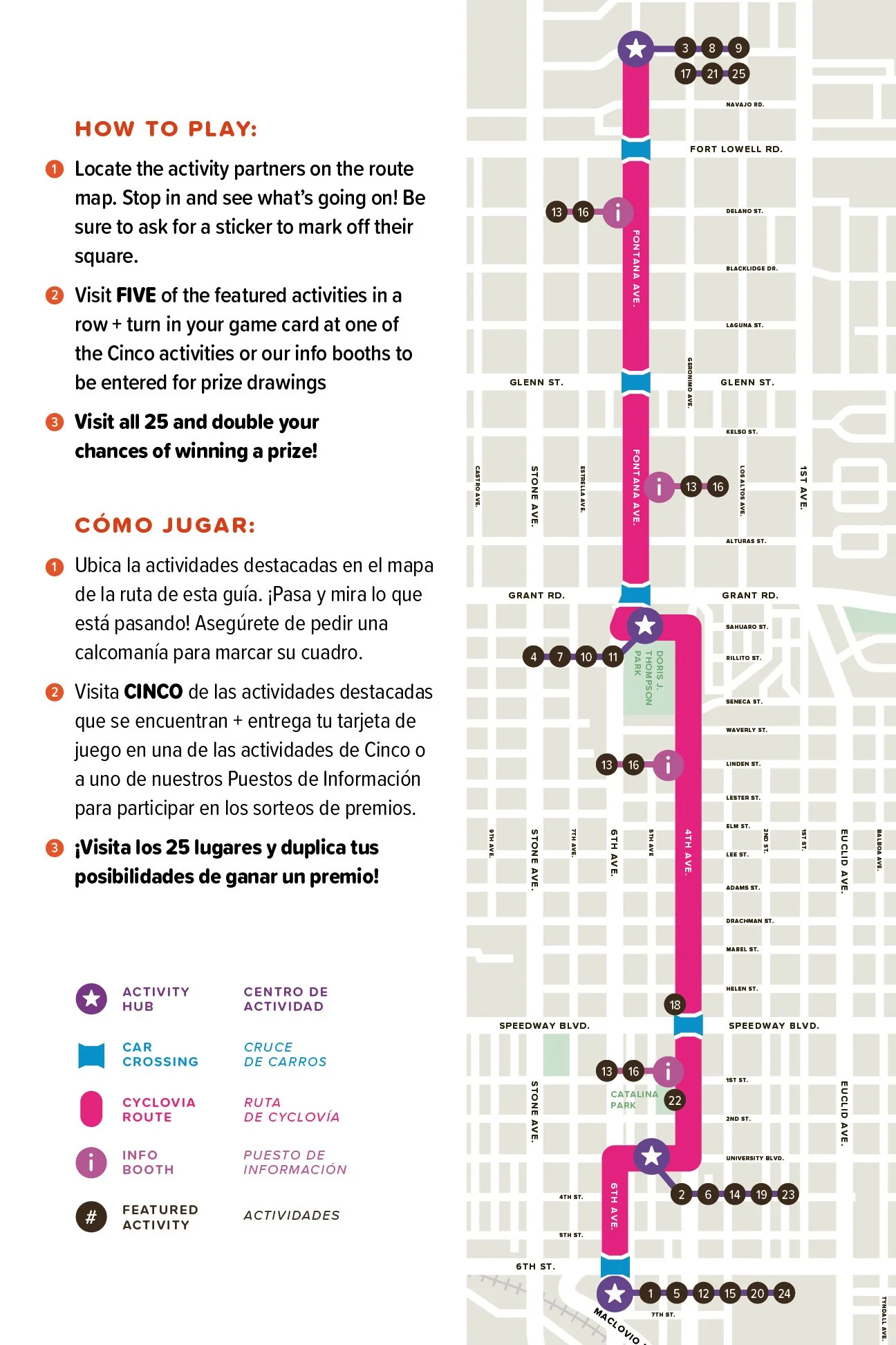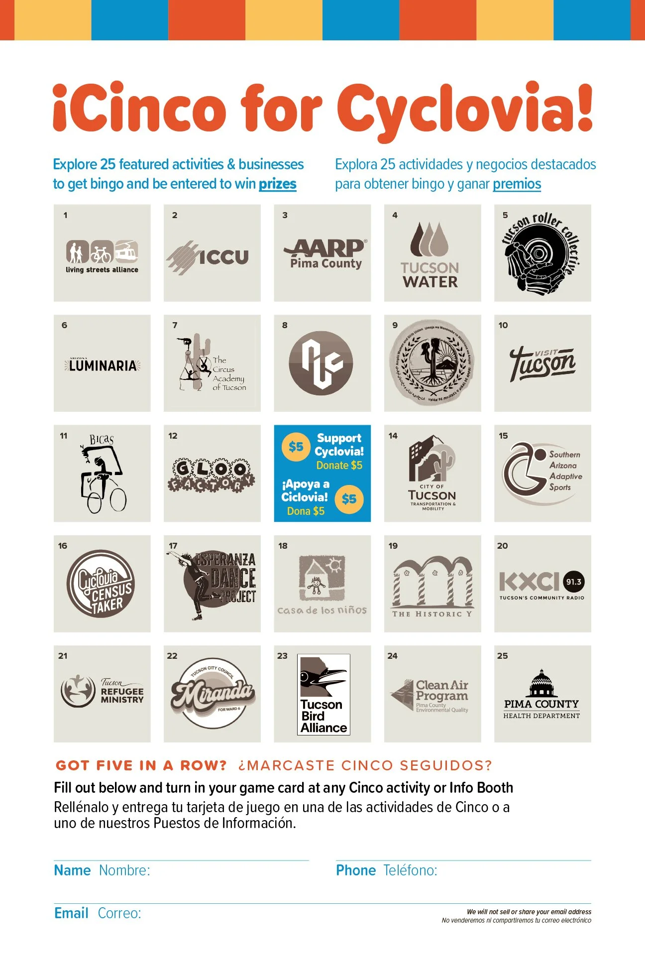 On each Cinco card, you will find 25 activities highlighting special activity partners, local businesses and of course, the Cyclovia Census.